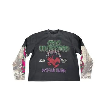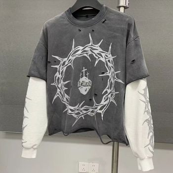 מסך קרעה גרפי מותאם אישית קרעה מודפס חומצה וינטג waffle במצוקה שכבה כפולה שרוול ארוך לגברים